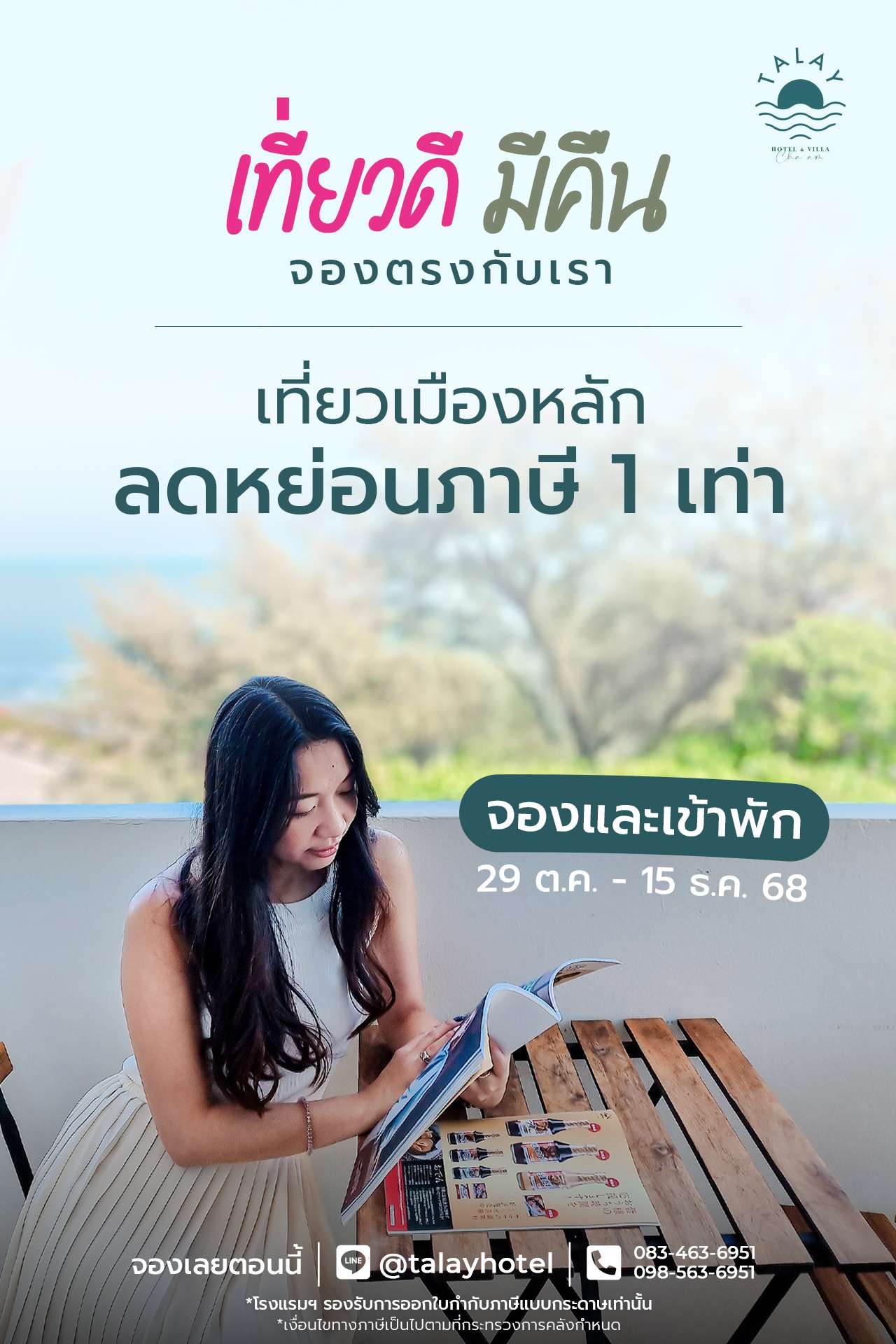– ช่องทางจองที่ร่วมรายการ : Inbox Facebook, LINE: @talayhotel, โทร. 098-563-6951 / 083-463-6951 / 032-471230, Walk-in ที่หน้าเคาน์เตอร์โรงแรม